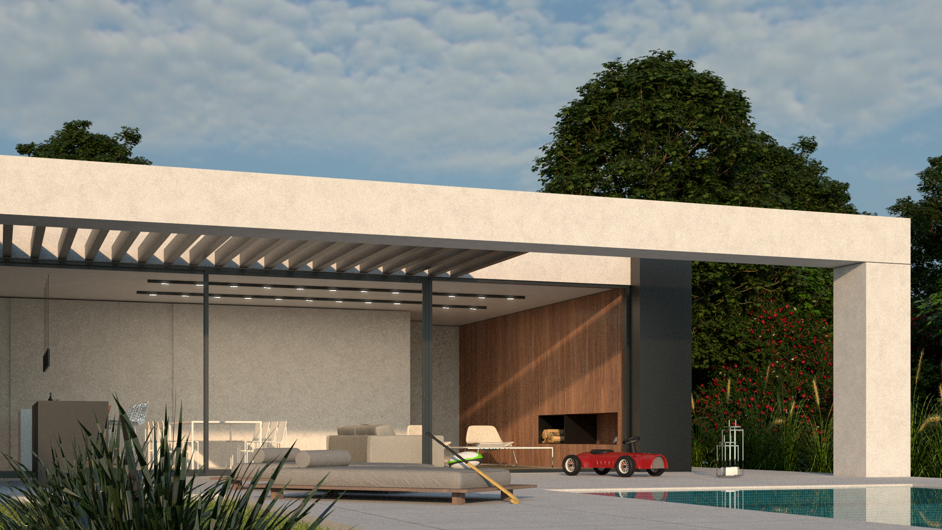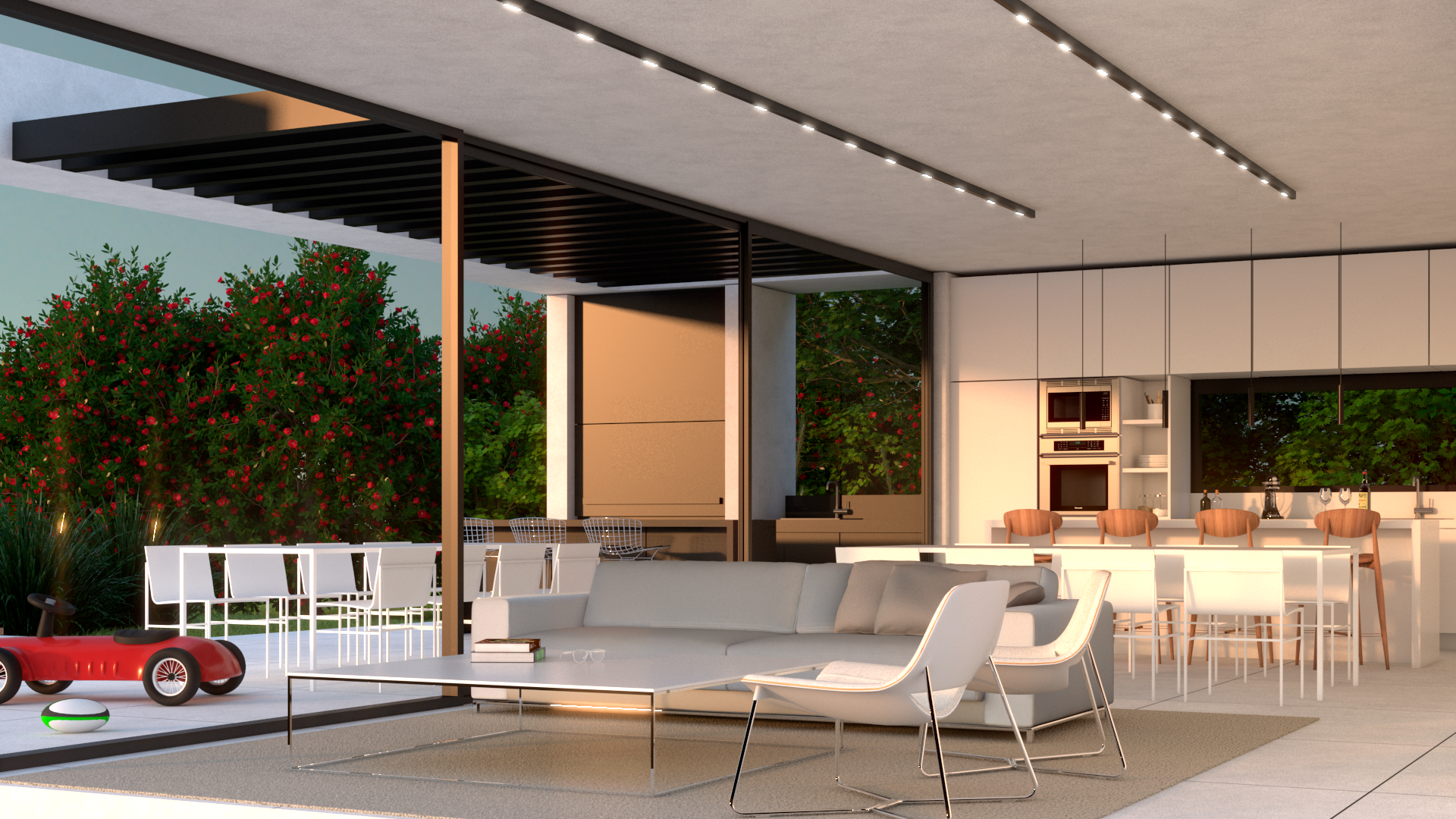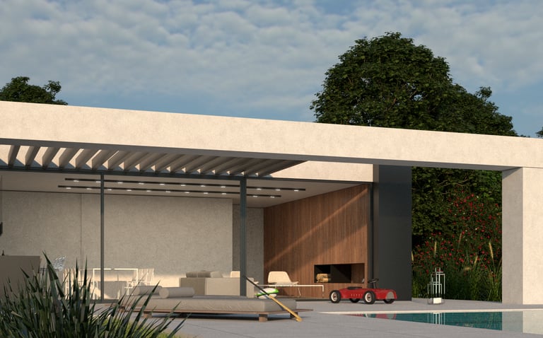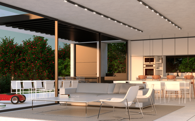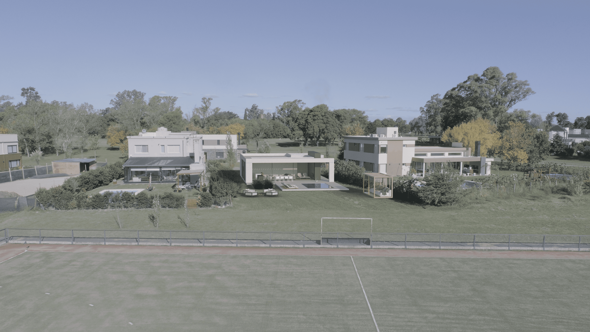 El proyecto tiene como objetivo primordial maximizar las magníficas vistas en el área social de la vivienda, logrando una fachada completamente acristalada de punta a punta hacia el jardín trasero. Esta disposición integra de manera fluida el estar, el comedor y la cocina con la galería y el entorno verde. Además, considerando la pasión de la familia residente por el hockey, se ha previsto una vista panorámica hacia la cancha que les permite disfrutar de los partidos.