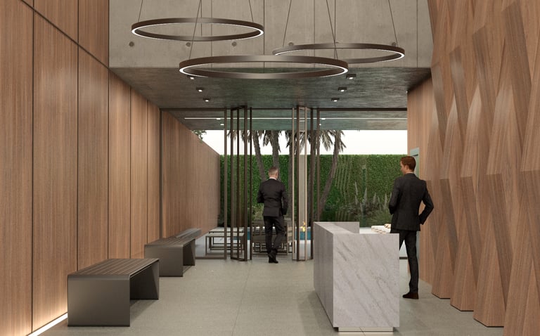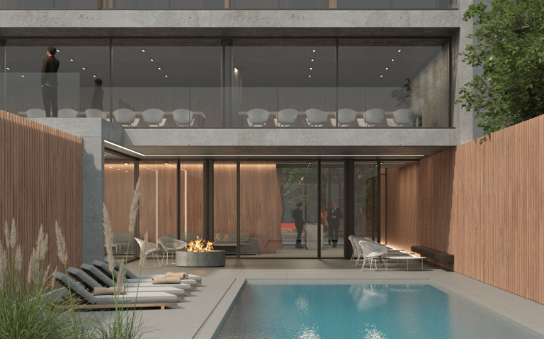 El proyecto se trata de un edificio residencial de 15 niveles entre medianeras, con un local gastronómico que complementa una zona en expansión dentro de este rubro. En la planta baja, se destaca la permeabilidad y la doble altura en el acceso y el local, creando una juego de de volúmenes de hormigón armado junto a la calidez que brinda la madera y vidrio.